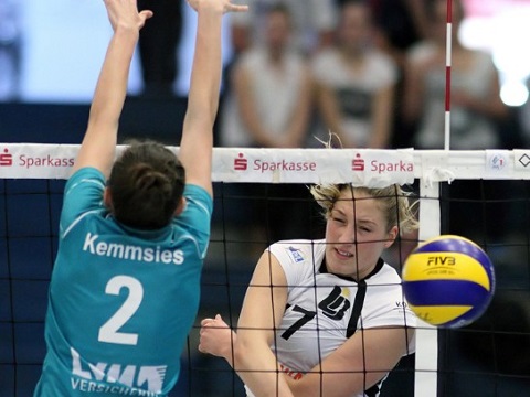 Es bahnte sich wieder ein Krimi an, bis zum 9:9 wagten die Kontrahenten den Schulterschluss. Dann aber schlichen sich wieder kleine Unzulänglichkeiten ein, die den KSC enteilen ließen. Sarah Petrausch und Tess von Piekartz verfehlten das Ziel, dazu leistete sich die niederländische Zuspielerin einen technischen Fehler – schon stand es 10:15.